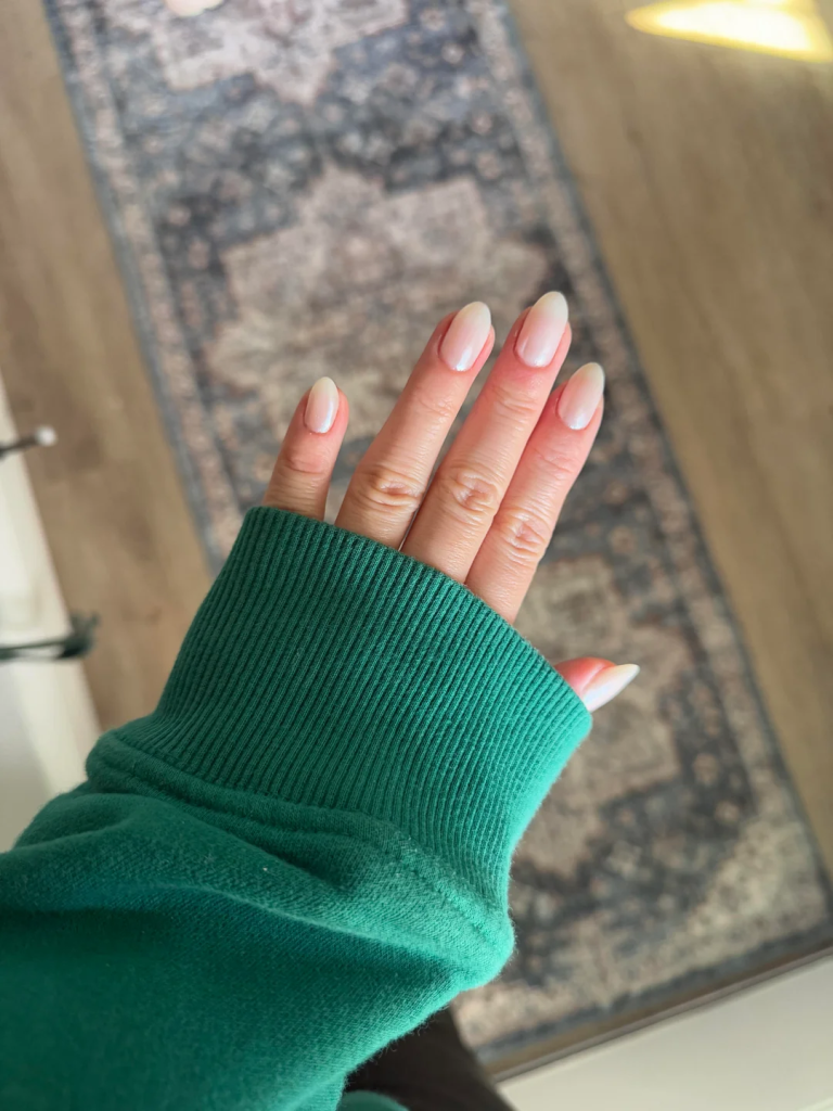 Almond shaped milky pink nails blend elegance with a soft look. This style is both trendy and timeless, making it suitable for any occasion. The milky pink hue enhances the almond shape, providing a delicate appeal that many find charming. They are easy to personalize with designs or embellishments.