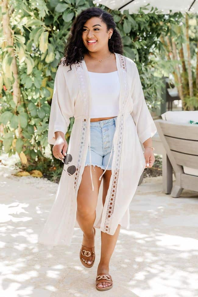 - Top: Lightweight and airy in white, this shirt can be worn open for a casual vibe.